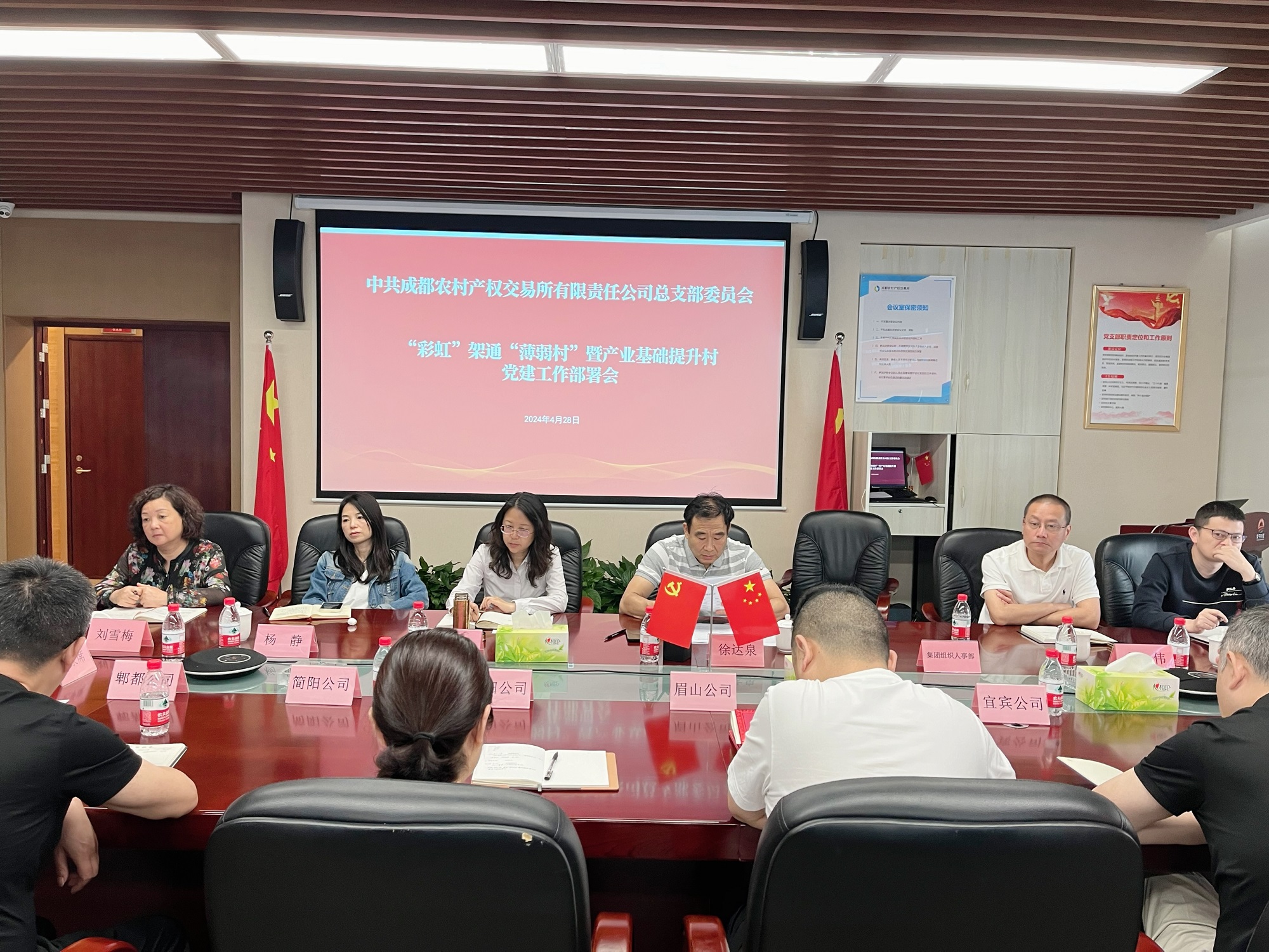 2024年4月28日,成都农交所党总支召开“彩虹”架通“薄弱村”暨产业基础提升村党建工作部署会,研究部署“彩虹”架通“薄弱村”基层党建工作项目和村企党组织结对共建工作。公司领导班子成员、各部门负责人各分子公司负责人及各党支部书记参加会议。