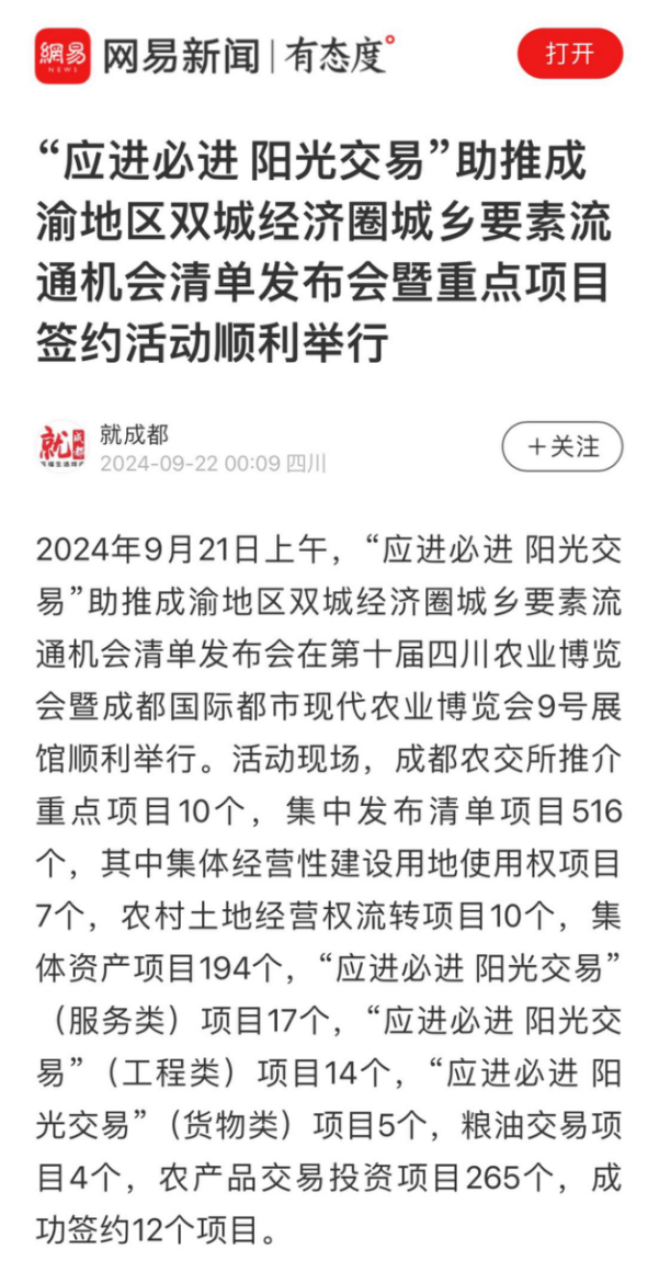 2024年9月21日上午,成都农交所“应进必进 阳光交易”助推成渝地区双城经济圈城乡要素流通机会清单发布会在第十届四川农业博览会暨成都国际都市现代农业博览会9号展馆顺利举行。活动现场,成都农交所推介重点项目10个,集中发布清单项目516个,其中集体经营性建设用地使用权项目7个,农村土地经营权流转项目10个,集体资产项目194个,“应进必进 阳光交易”(服务类)项目17个,“应进必进 阳光交易”(工程类)项目14个,“应进必进 阳光交易”(货物类)项目5个,粮油交易项目4个,农产品交易投资项目265个,成功签约12个项目。