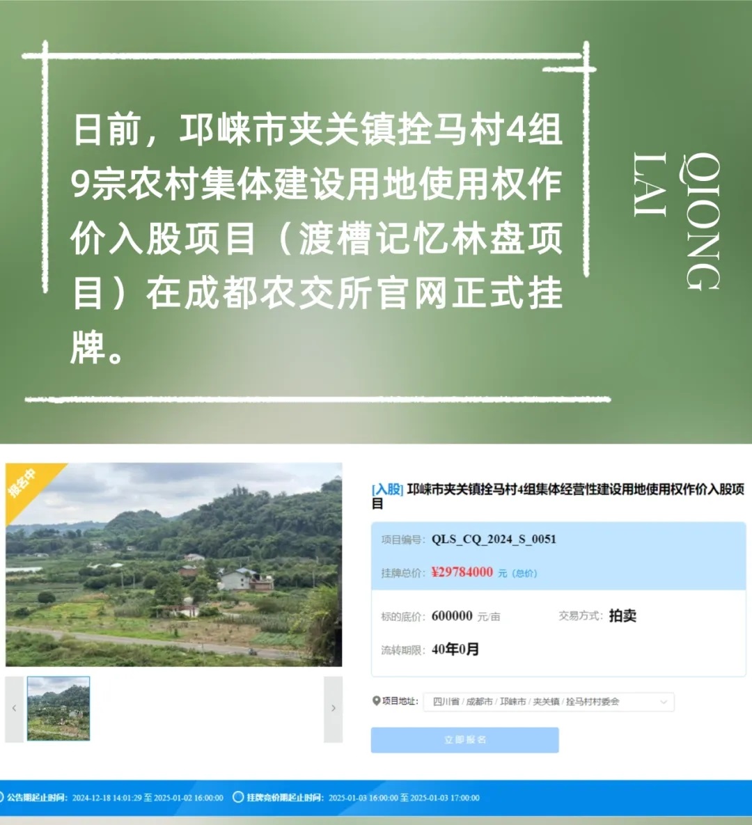 邛崃首宗农村集体建设用地使用权作价入股项目挂牌
